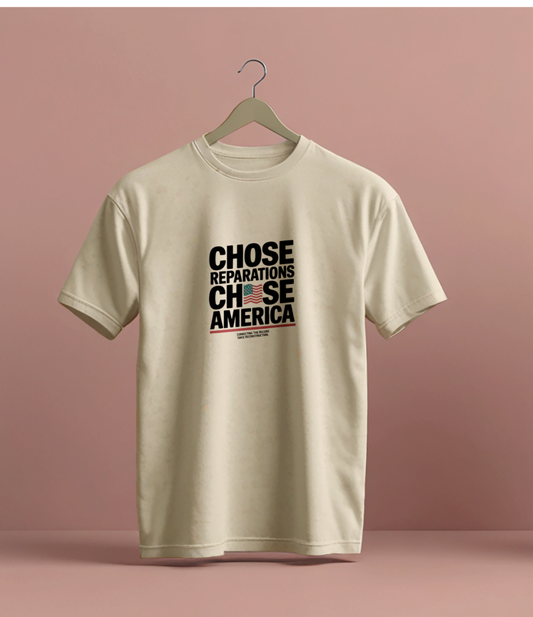This design reframes patriotism through the lens of justice and repair. The front statement—“Chose Reparations, Chose America”—pairs bold black typography with a subtle red-striped American flag, symbolizing moral choice and national renewal. The back unites power and principle with a raised fist over a stylized flag inside a circular seal reading “Reparations: A National Duty,” representing strength, identity, and the shared responsibility to make America whole through reparative action.